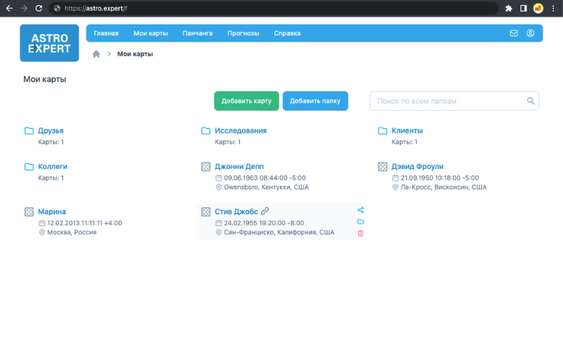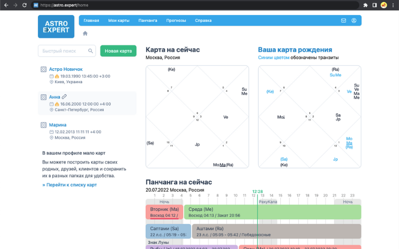 Быстрое добавление карты, быстрый поиск, последние открытые карты, текущие транзиты, ваша карта рождения с транзитами и панчанга на сейчас – все это на главной странице.